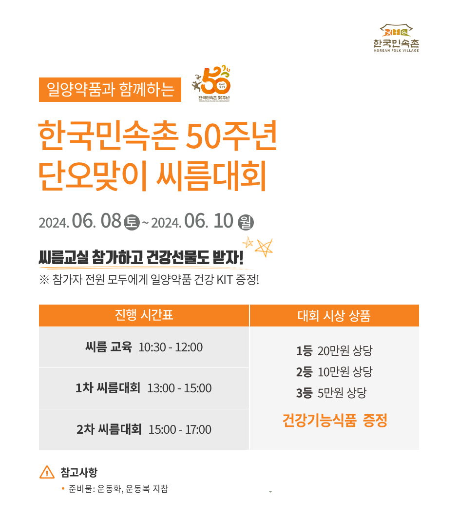 - 한국민속촌 50주년을 맞아 일양약품의 후원으로 단오맞이 씨름대회를 개최합니다.