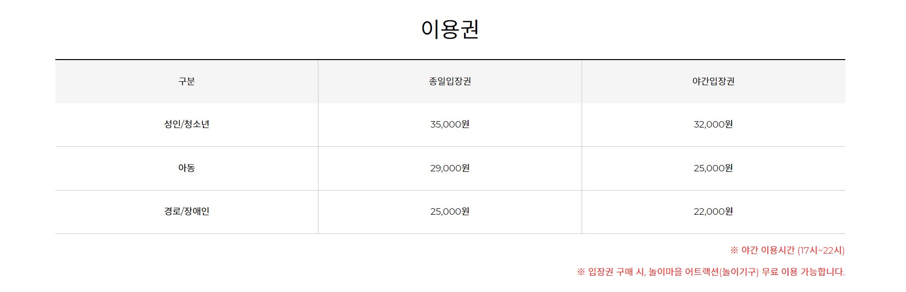 - 금, 토, 일 및 공휴일 5시 이후 야간권: 18,000원